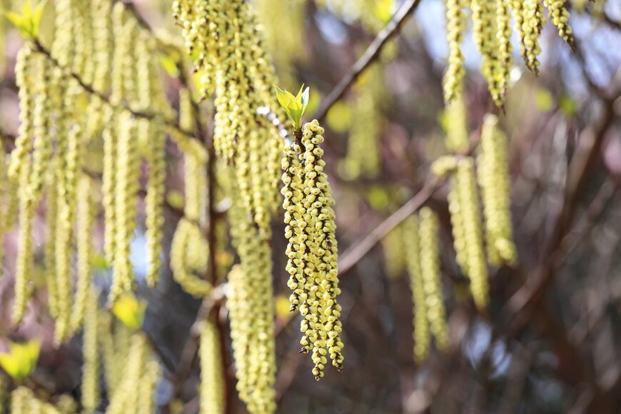 日本原産で雄株と雌株に分かれるのが特徴のキブシ。ブドウの粒のような黄色い花が5~10センチほどの紐状に連なり、遠目に見ると黄色のネックレスのよう。