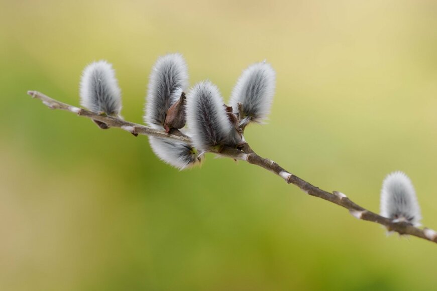 モフモフの花穂が愛らしいネコヤナギ。3~4月にかけて白っぽい綿毛の花穂が開き、まさに猫の尻尾のような花姿がユニークです。