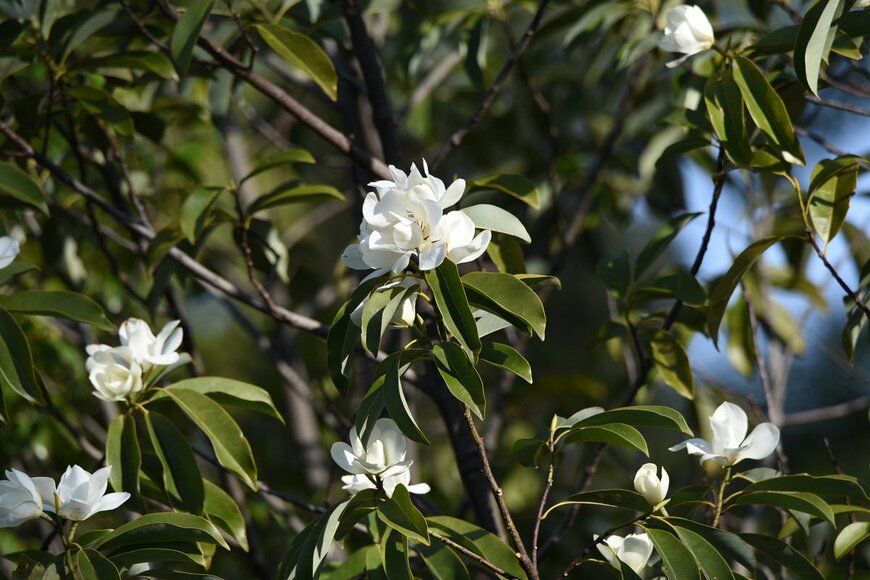 白い大きな花がインパクト抜群のミヤマガンショウ。中国に自生する常緑樹で、満開時には白い花が木全体を覆いつくすように咲き広がります。