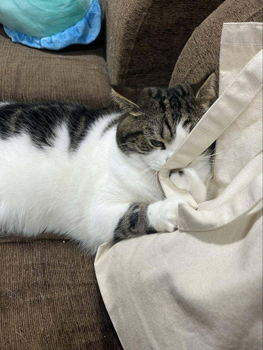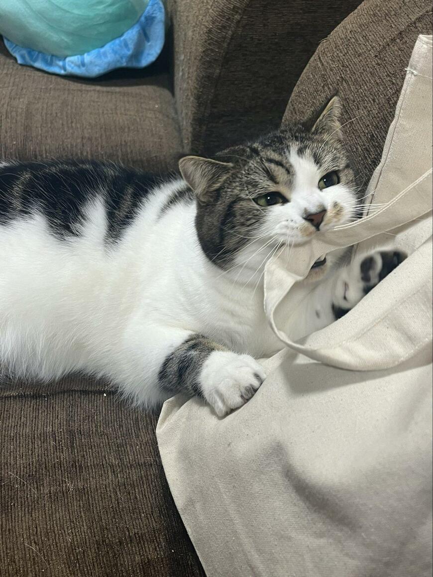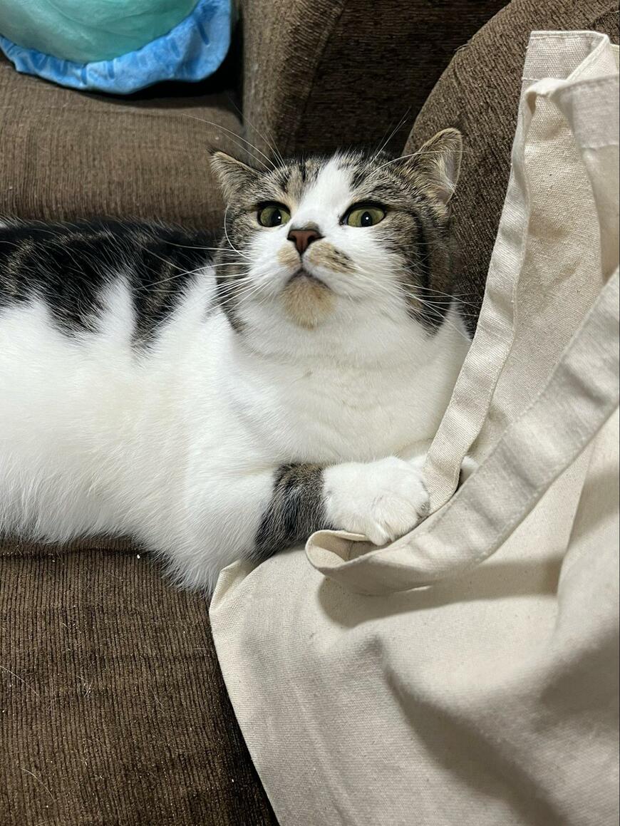 そこに写っているのは、猫の男の子「おにく」くんです。帰宅した飼い主さんのトートバッグに寄り添いながら、若干怪訝そうな表情を浮かべています……!