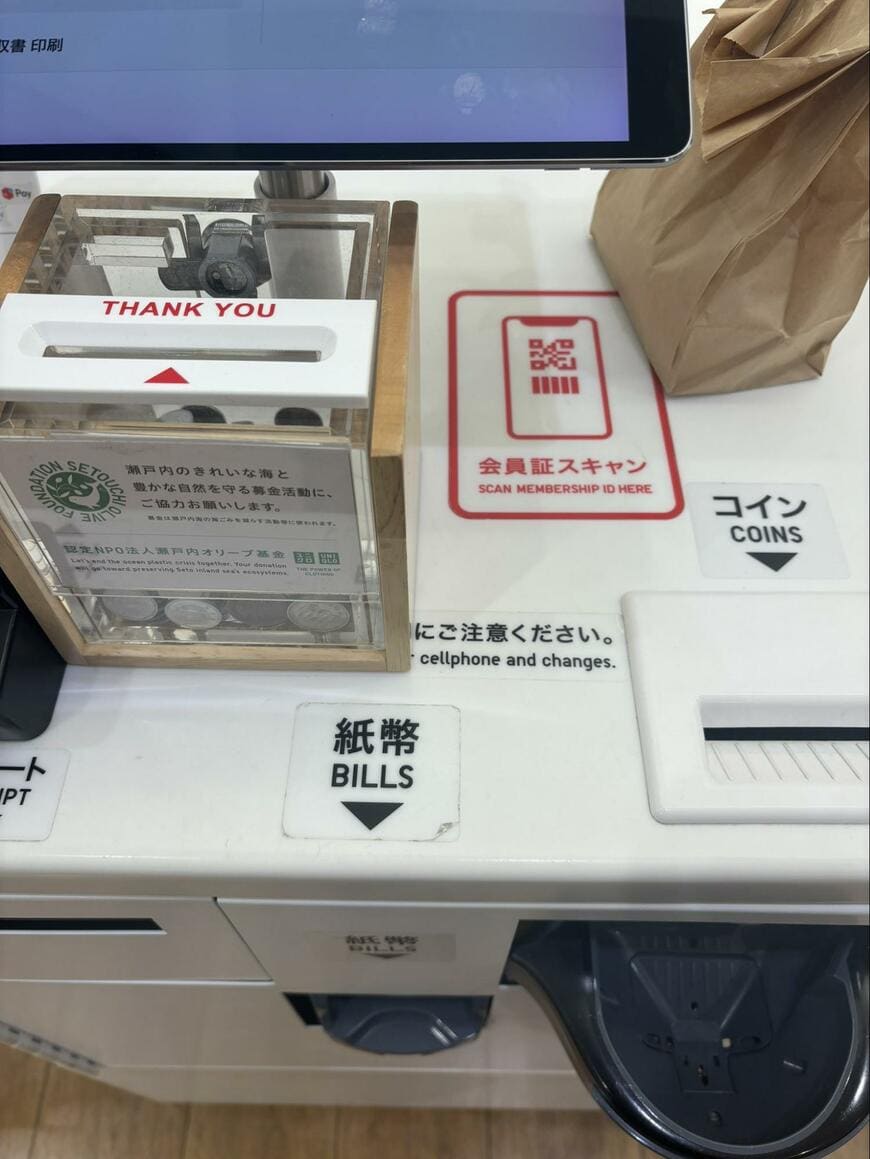 そこに収められていたのは、ユニクロのセルフレジ。レジには紙幣と小銭を入れる場所がありますが、そのすぐそばには瀬戸内海の環境保全のための募金箱も設置されています。