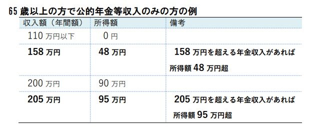 日本年金機構「所得金額の早見表」によると、特殊な控除の要件がない場合、公的年金168万円の課税所得は58万円です。