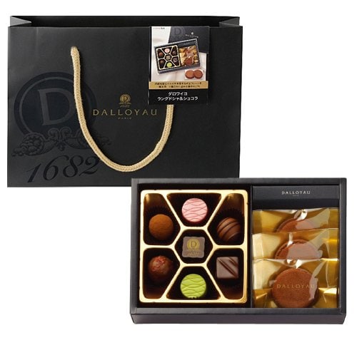 「ダロワイヨ ラングドシャ&ショコラは高級感のあるショッパーの中に、ビターキャラメルチョコをサンドしたラングドシャと粒チョコレートを詰め合せた、満足感のあるギフトです。」