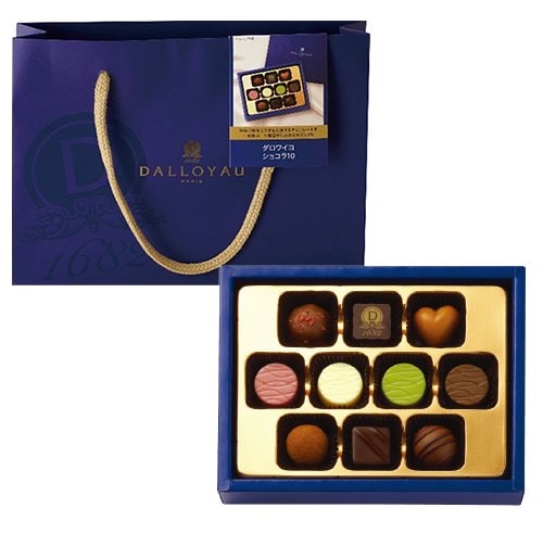 「ダロワイヨ ショコラ10はシックな紺色のショッパーの中に、ダロワイヨのスペシャリテ「オペラ」や「マカロン」をイメージしたチョコレートなど、多彩な味のチョコレートを詰合せました。」