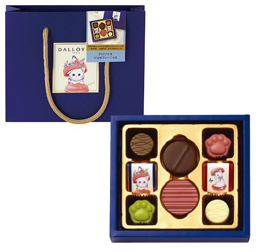 「ジョセフィーニャ8はダロワイヨの人気キャラクター「ジョセフィーニャ」をデザインしたギフトです。肉球型のチョコレートとジョセフィーニャのラベルデザインチョコ、華やかなディスクチョコなどを詰め合わせました。」