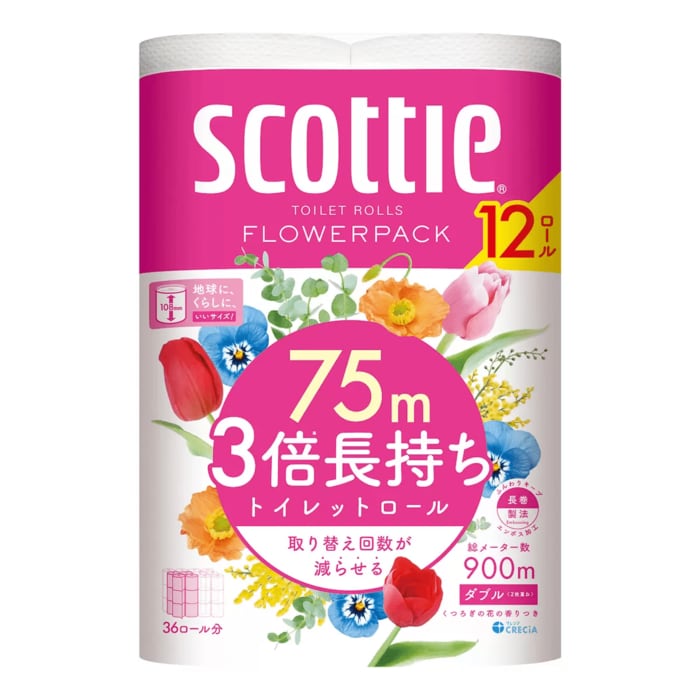 原材料にパルプと高品質な牛乳パックリサイクルパルプを使用しており、スコッティ独自のふんわりキープ長巻製法で快適な使い心地。くつろぐ花の香りつきでリラックスしたトイレタイムを過ごせます。