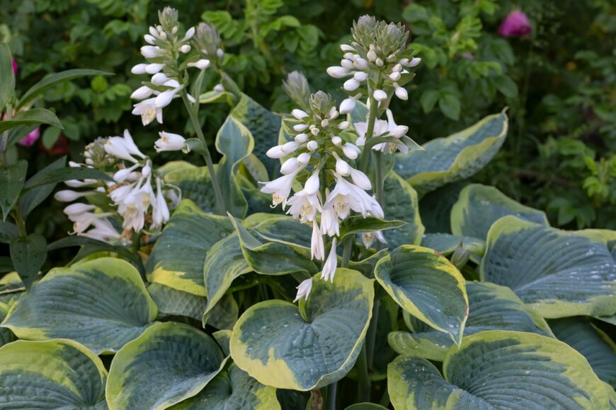 ギボウシ(ホスタ)は東アジア原産の多年草。6月~7月に白や紫の花を咲かせます。日陰でもよく育つ植物で、大型の品種は存在感バツグンです。