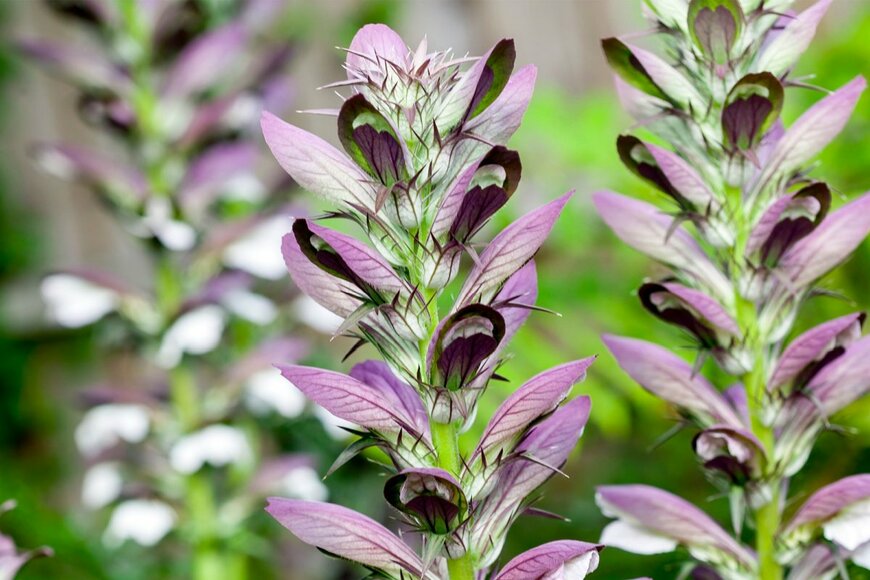 アカンサス モリスは、草丈、株張りともに1.5メートルほどになる大型の多年草。半日陰でも育てることが可能です。6月~8月に咲く花は、白い花弁と紫色のがくのコントラストがエレガントでユニークです。