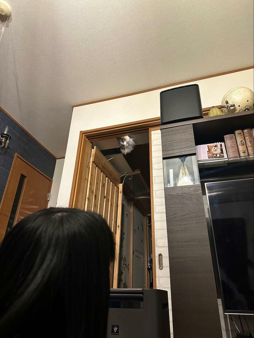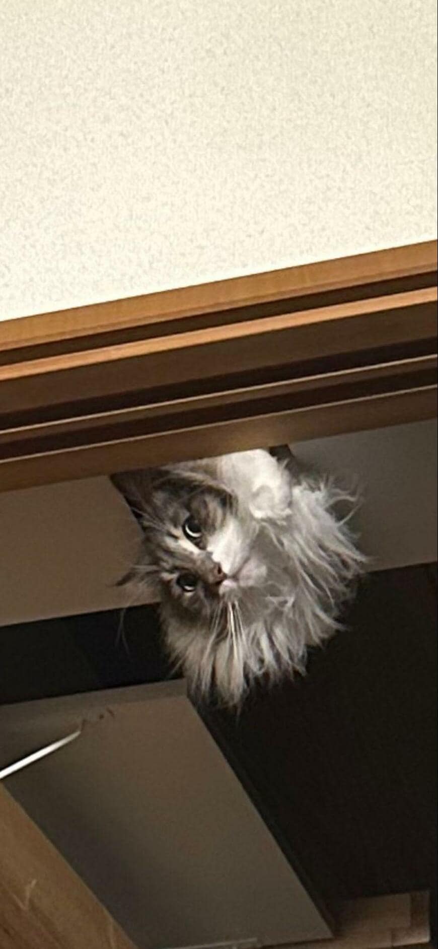 この場所にはキャットウォークが設置されているそうで、そこから顔を出していたレイくん。その姿はちょっぴりホラーな印象です……!