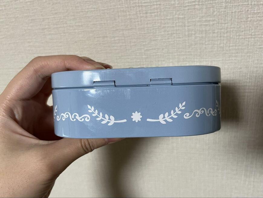 こちらがセリアで販売されている「デザイン缶」です。上品なデザインのアイテムで、高級感があります。アンティークオルゴールのような見た目の缶です。