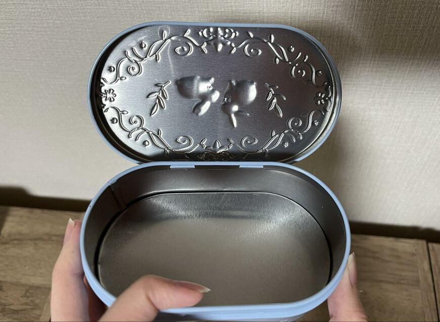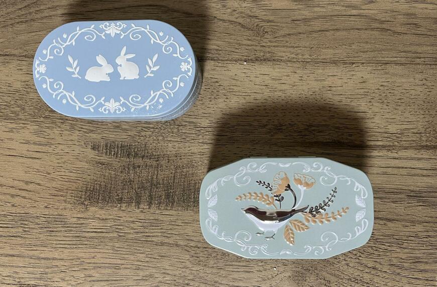 ウサギや小鳥がレリーフされている缶です。アンティーク感ある、オルゴールのような見た目のアイテムです。