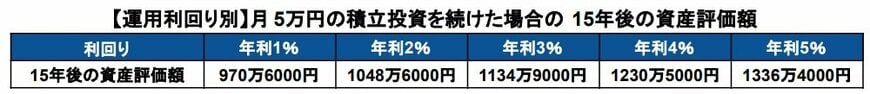 運用利回り別にみた、毎月5万円の積立投資で15年後に築ける資産額は以下のとおりです。