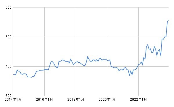 なお、全都市の小売価格の平均は510円(2023年12月時点)、前年同月比では+7%となっています(いずれも小数点第一位を四捨五入)。