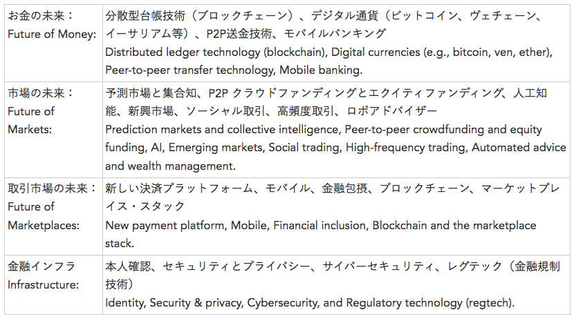 この一覧表では、AIとビッグデータ(機械学習、予測分析)、仮想通貨(スマート契約、生体認証)、分散コンピューティング(DLT、ブロックチェーン)、モバイルアクセスとインターネット(API、電子財布、新決済プラットフォーム)という4つの「破壊的技術(disruptive technologies)」について、イノベーションが発生している金融の各事業領域に照らし合わせています。さらに各領域を、意思決定支援、預金、貸出、決済、リスク管理という軸で区分しています。