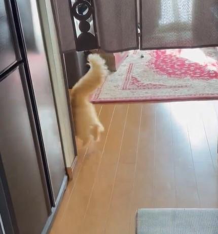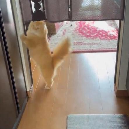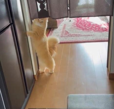 しばらくママさんを眺めていましたが、突如両手を壁につけて二本足で立ち上がりました。終始太い尻尾を「ファサファサ」と動かし続けるエマちゃん……。