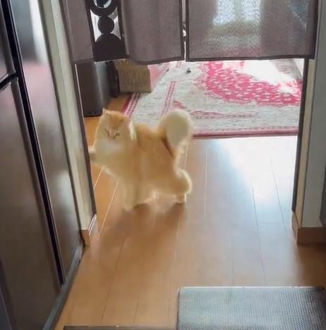 この日はママさんが美容院に足を運んだそうで、帰宅したママさんの姿を見たエマちゃん。動画の冒頭から表情には警戒心が漂い、尻尾がボワッと膨らんでいます。