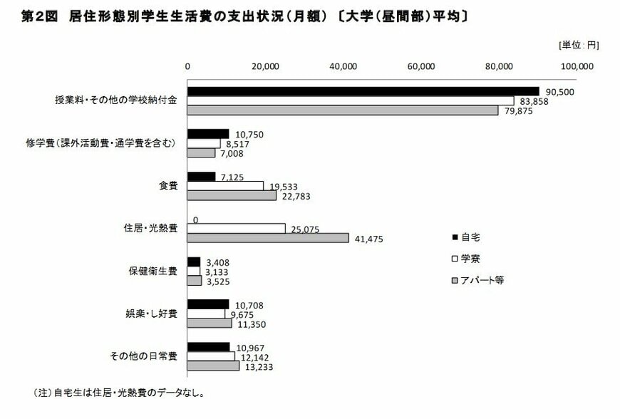 独立行政法人日本学生支援機構「令和2年度 学生生活調査報告」は居住形態別に学生生活における支出状況(月間)を明らかにしています。