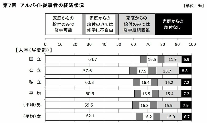 【図表4】では、アルバイト従事者のうち「家庭からの給付のみで修学可能」な学生がもっとも多い結果になっています。