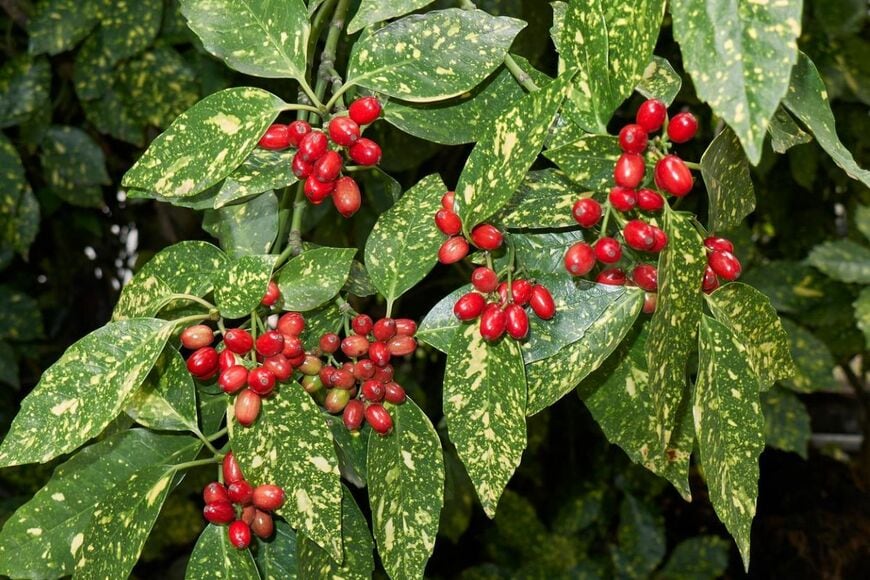 斑入りの品種もあり、日陰の空間を明るく彩ってくれます。雄株と雌株をセットで植えると冬に赤い実をつけるので、さらに鮮やかですよ。