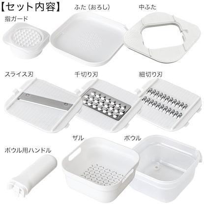 ふた(おろし)・中ふた・スライス刃・千切り刃・細切り刃・ザル・ボウル・指ガード・ボウル用ハンドルがセットになっているアイテムです。