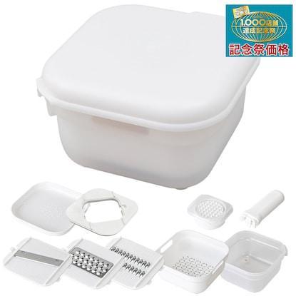 スライス・千切り・細切り・おろし・水切り・和える・保存の合計7つに使える調理用ツールが1つになっています。
