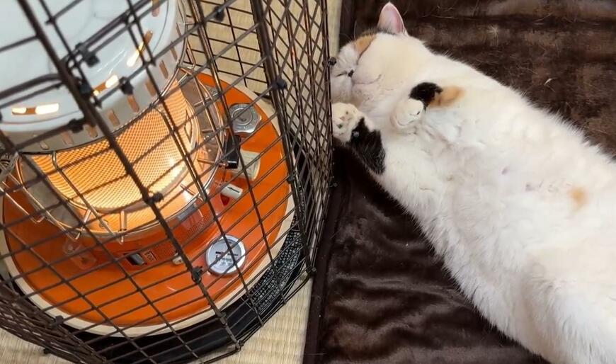 「寒いからストーブを堪能する猫」というコメントとともに投稿されたのは一本の動画でした。そこに写っているのは猫の「あんみつ」ちゃんです。