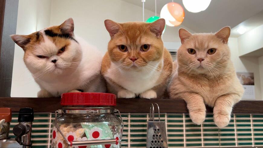 こちらは同居猫の「とんかつ」くんと「ぽてと」くんと整列して、ご飯の催促をしている様子。あんみつちゃんの、もふもふのフォルムにキリッとした瞳といった絶妙な表情が、なんとも魅力的ですね。