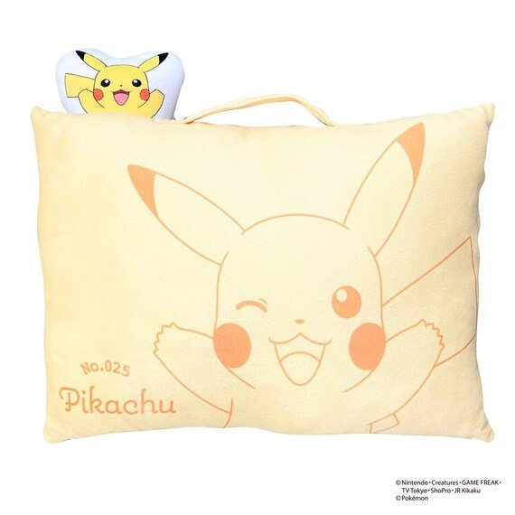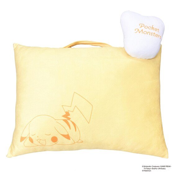 かわいいピカチュウのマスコットがついた小さめの枕。持ち運びに便利な取っ手が付いており、ふわふわのやさしい寝心地でお子さんのお昼寝タイムにぴったりです。