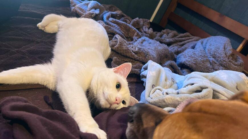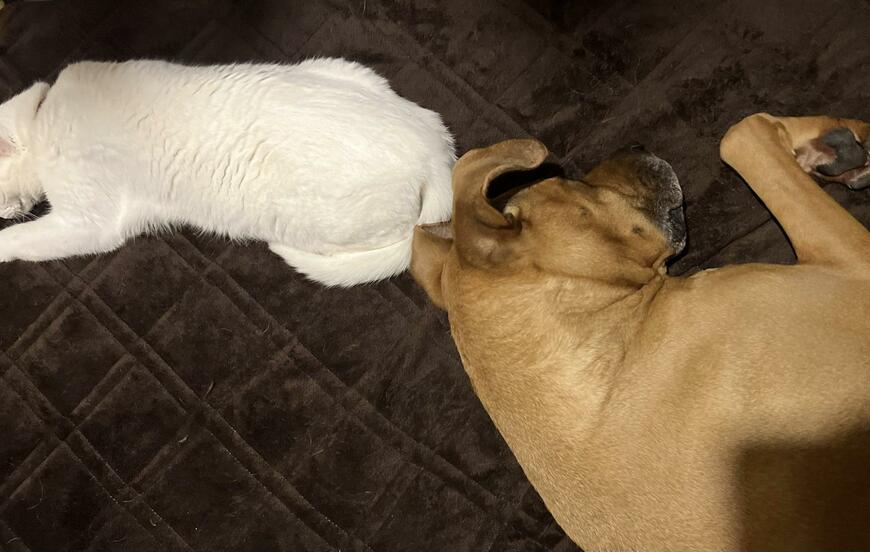 Xでたくさんの注目を浴びているのは、猫の「ソウ」くんと犬の「アギト」ちゃん。二匹の共通点は「甘えん坊」なところだそうで、普段から飼い主さんと一緒の布団で寝ているのだとか。