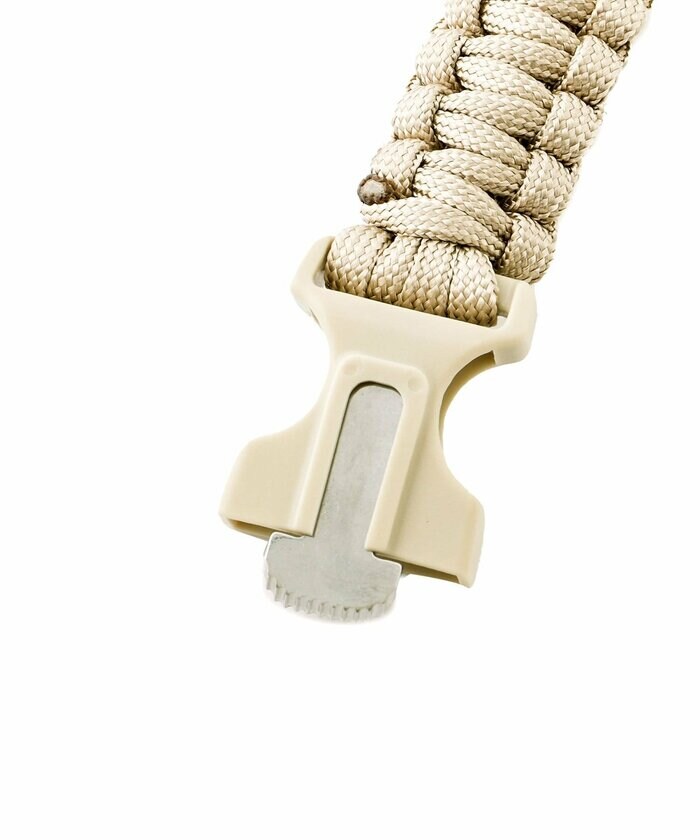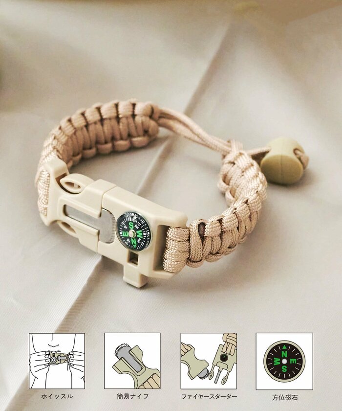 ホイッスル、簡易ナイフ、ファイヤースターター、方位磁石の4つがセットになったミサンガです。災害時はもちろんアウトドアでも大活躍!ベルトは長さを調節できて、手首に簡単に取り付けられます。