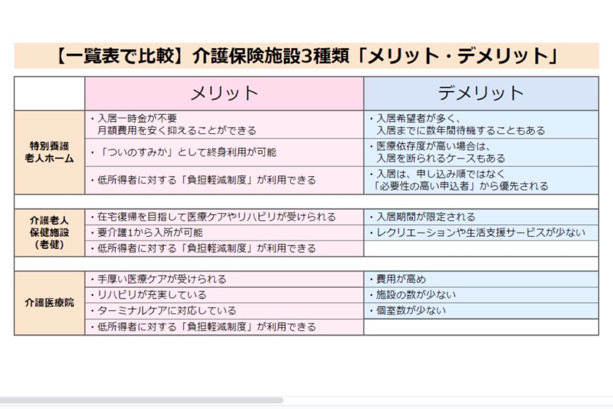5. 【一覧表で比較】3つの介護保険施設のメリット・デメリット