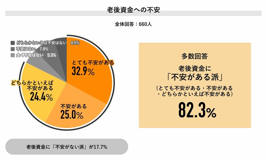 同調査の回答者全体の660人に老後資金への不安有無を聞くと「不安がある派」は82.3%。過半数を大きく超える結果となりました。