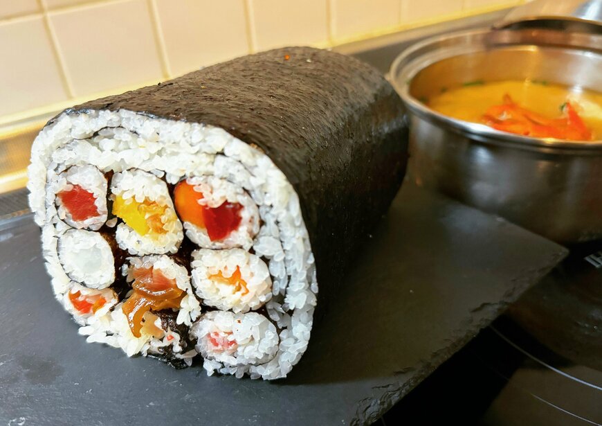 そこには、数本の細巻きをさらに酢飯と海苔で巻き上げた豪華すぎる恵方巻の姿が。さまざまな具材が盛り込まれた恵方巻にテンションが上がりますね!