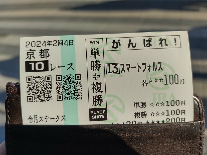 勝負を決めにいった京都10レース、4歳以上オープンの令月ステークス(ダート1200m)では、1番人気のスマートフォルスの単勝と複勝100円ずつを購入。