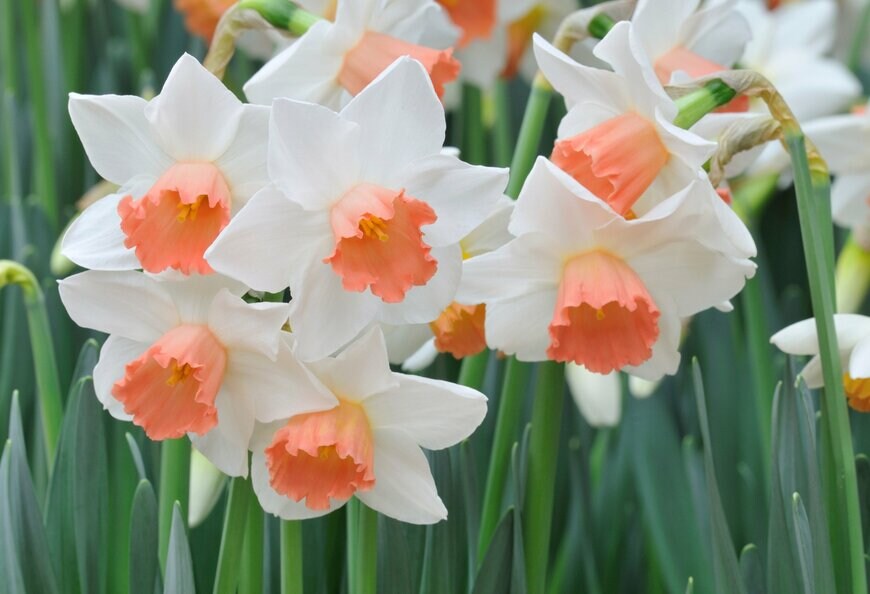 和風の庭はもちろん、洋風にもマッチする花、スイセン(水仙)。白×黄色の花が一般的ですが、オレンジやピンクなど多彩な色合いが揃っています。
