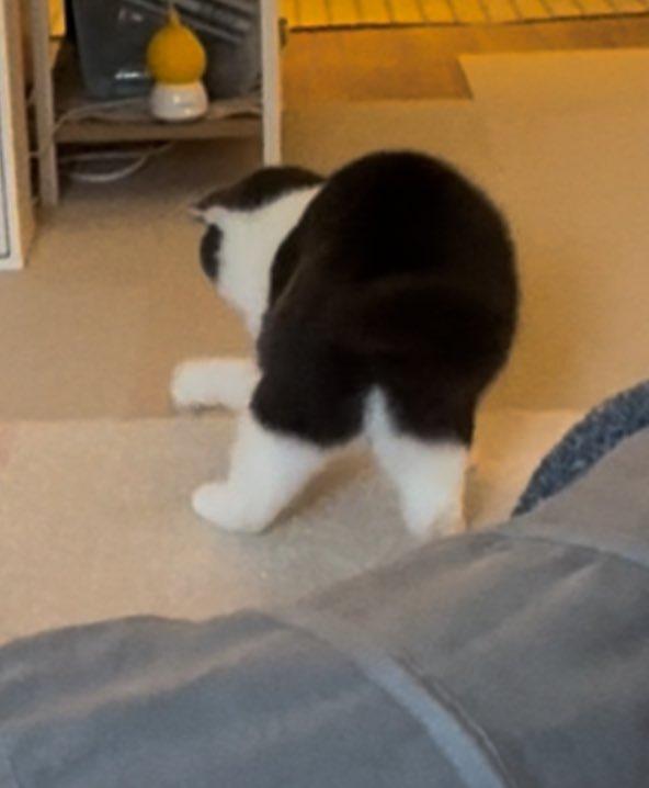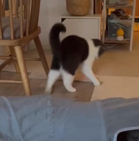 Xで注目を浴びているのは、猫の女の子「おもち」ちゃんです。おもちちゃんはこの日、おもちゃらしき物を追いかけるのに夢中になっていた様子。もっちりとした足をあちらこちらに動かし、一生懸命におもちゃを追っています。