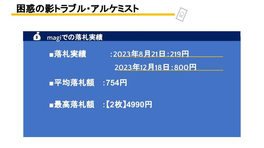 1枚あたりの最高落札額は「【2枚】困惑の影トラブル・アルケミスト 2枚:4990円」でした。