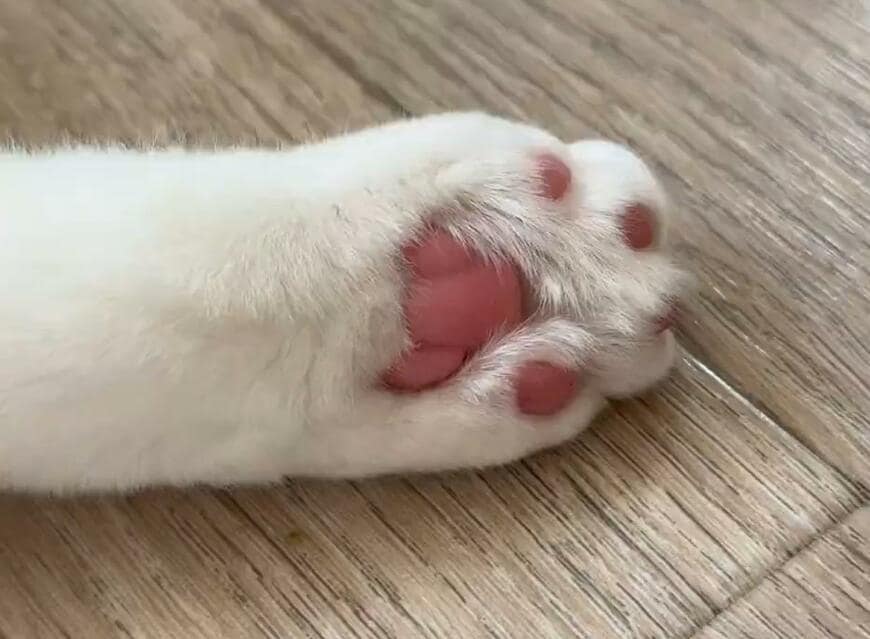 そこに写っているのは猫の女の子「おもちちゃん」。たっぷり遊んだ後のようで、温かそうな肉球はプニプニの状態に。猫好きさんにはたまらないワンショットですね。