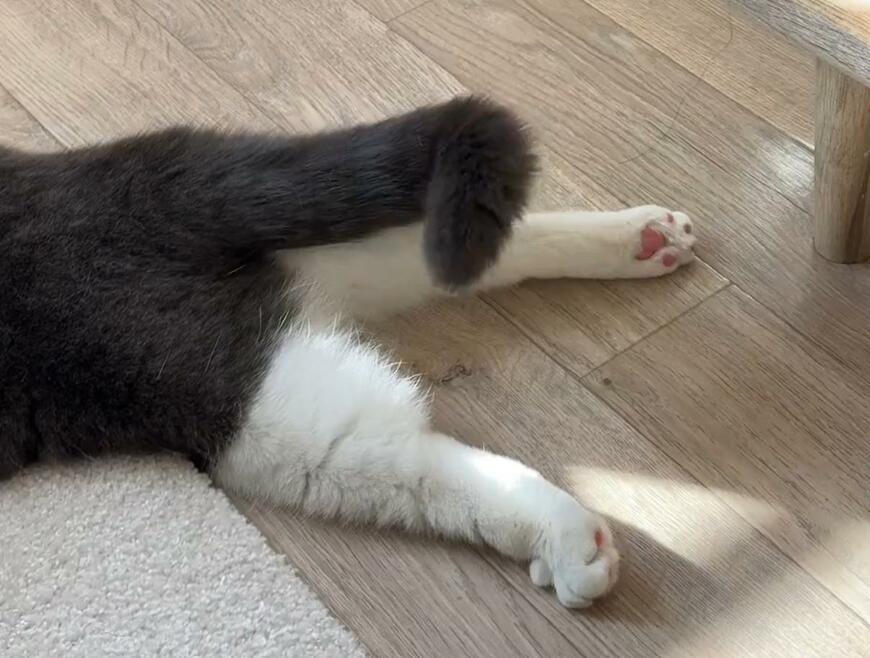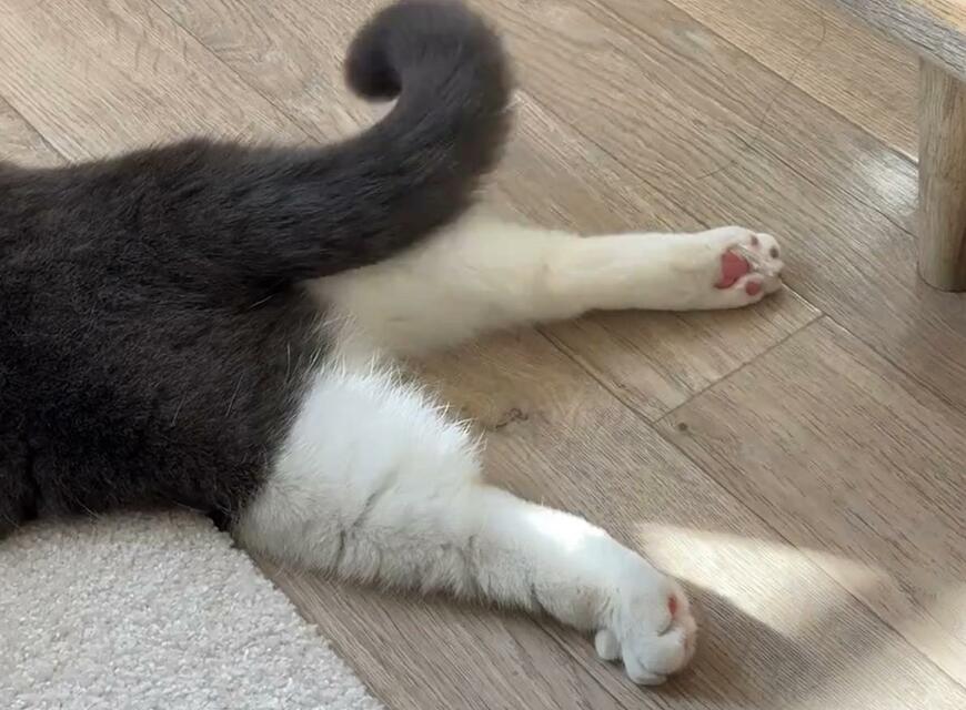 その後カメラが離れると……?映し出されたのは、うつ伏せになって休憩するおもちちゃんの姿。両脚をちょこんと広げ、ご機嫌そうにしっぽをパタパタしています!