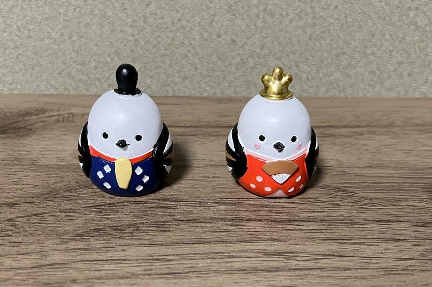 ここからはシマエナガフィギュアの細かいデザインを紹介していきます。こちらは女雛と男雛です。青と赤の着物をそれぞれ着ています。柄も入っていておしゃれです。
