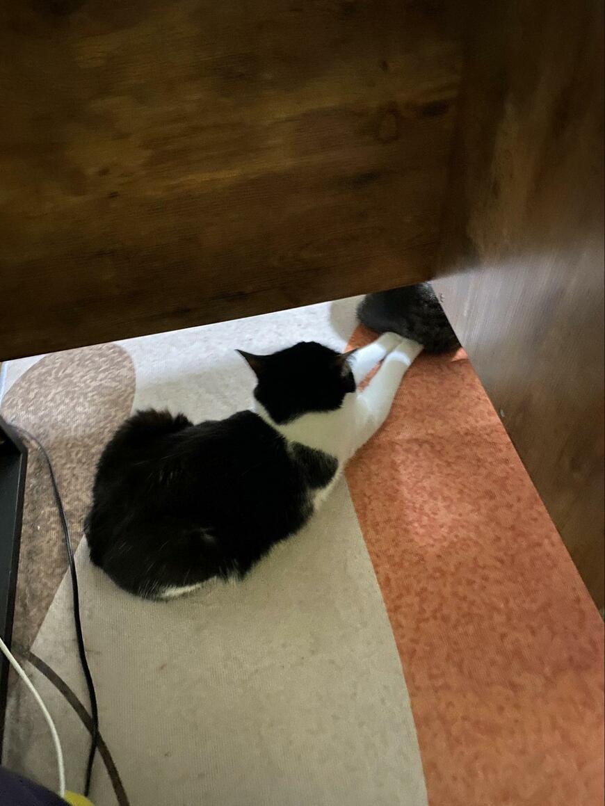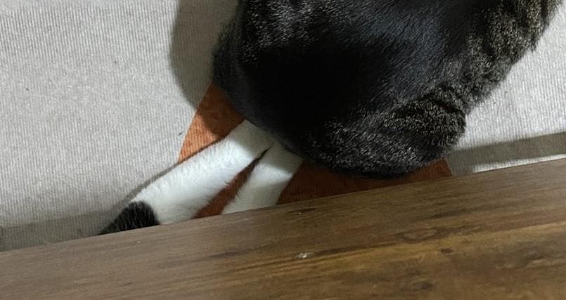 二枚目の写真には、モズクちゃんの前方を「上から写した光景」が写っていました。モズクちゃんが手を差し込んでいたのは、同居猫「シイタケ」くんのおしりでした……!