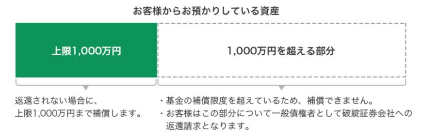 証券会社が返還できない資産については、日本投資者保護基金が一人当たり上限1000万円まで補償を行ってくれます。
