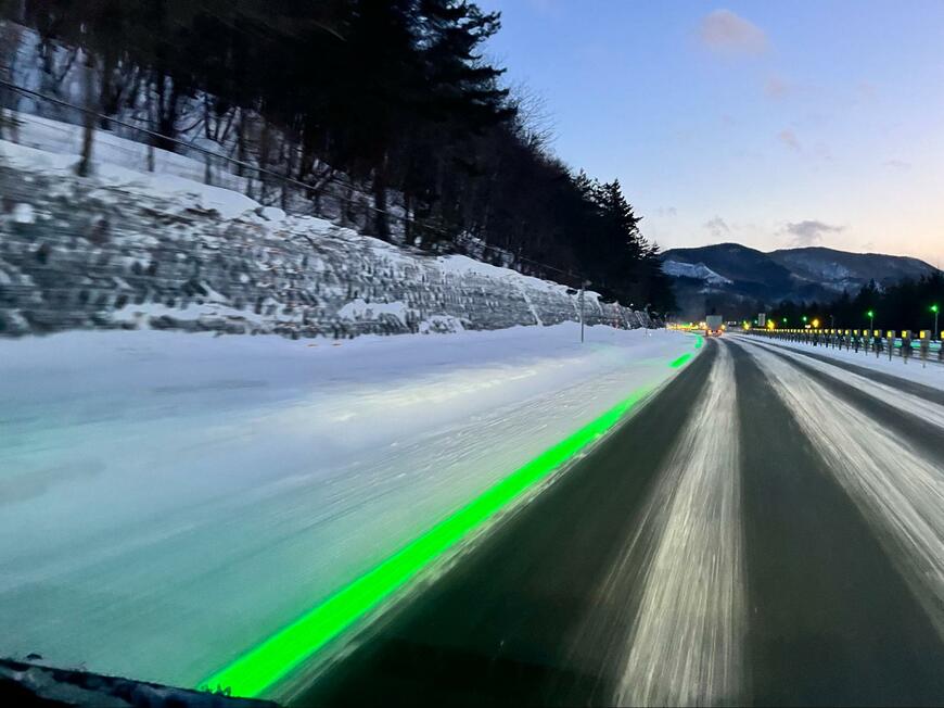 そこに収められているのは、雪が降り積もった青森県内の東北道の光景。視線を惹くのは、鮮やかな緑色に発光する車線らしきものです。