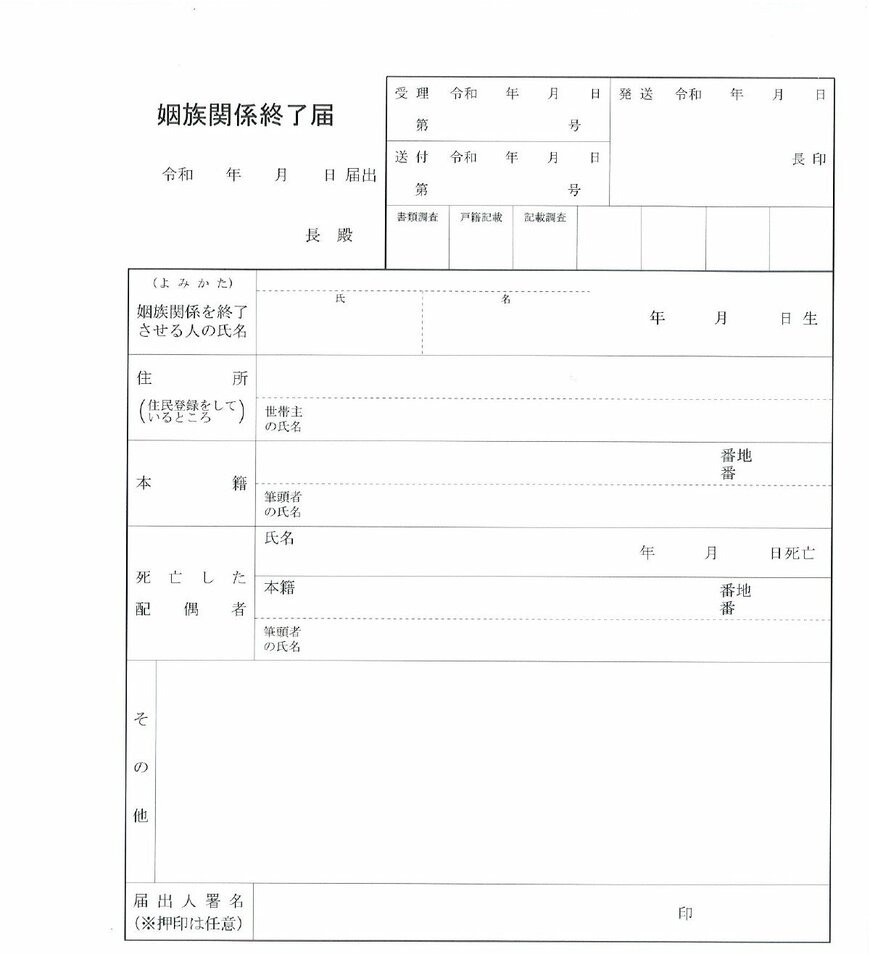 姻族関係終了届とは、夫婦のどちらかが死亡した後、その亡くなった配偶者の血族(義理の両親、義理の兄弟姉妹など)との関係を終了させることができる届け出のことです。俗に「死後離婚」とも呼ばれています。
