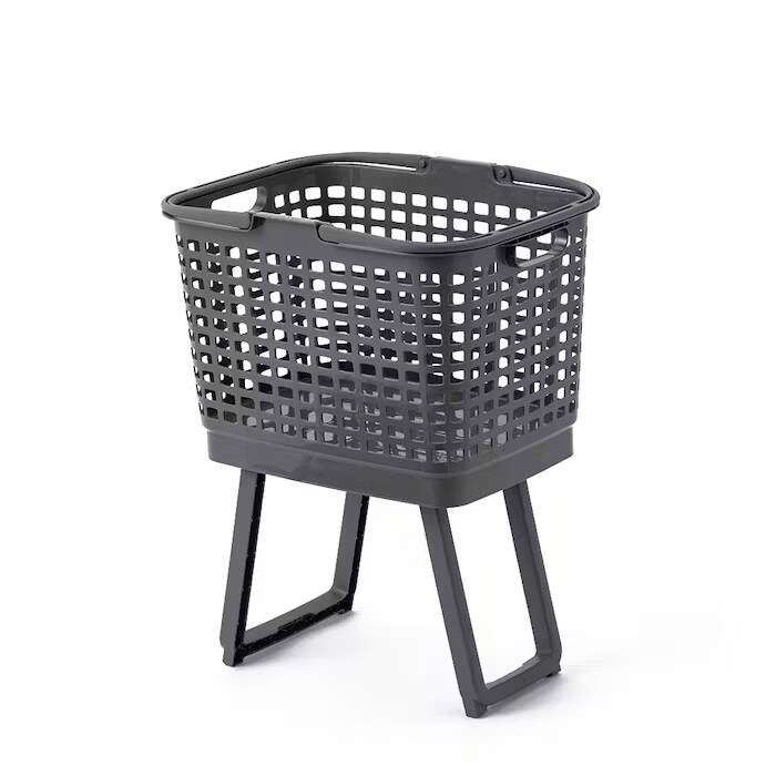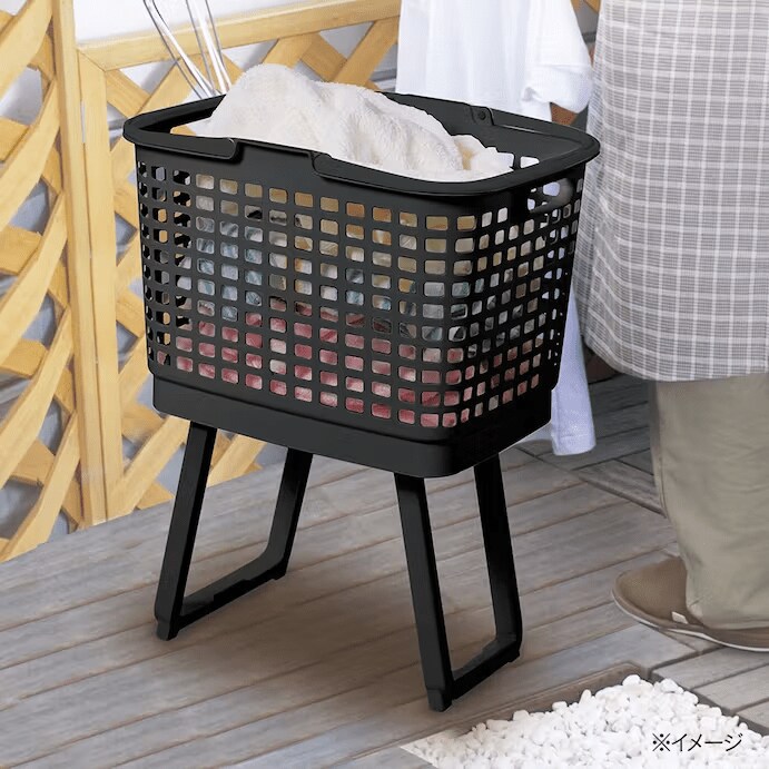 洗濯カゴの底についた収納式のスタンドが、洗濯干し中のスクワット運動による腰の負担を軽減し、楽な体勢で家事ができます。