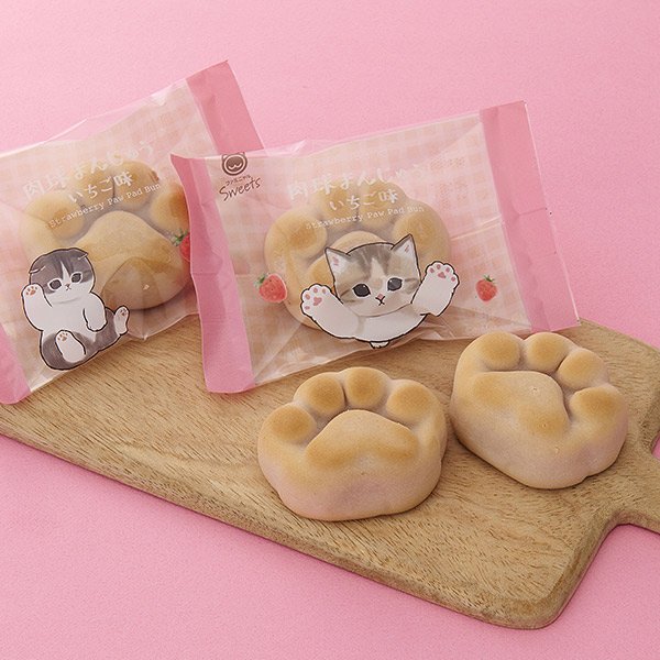 「肉球まんじゅう いちご味はねこの肉球をイメージしたピンク色のかわいらしいおまんじゅうです。甘酸っぱいいちごの味わいとほんのりとしたミルクのハーモニーをお楽しみいただけます。パッケージは「mofusand」とコラボレーションしたデザインで、全2種類です。」