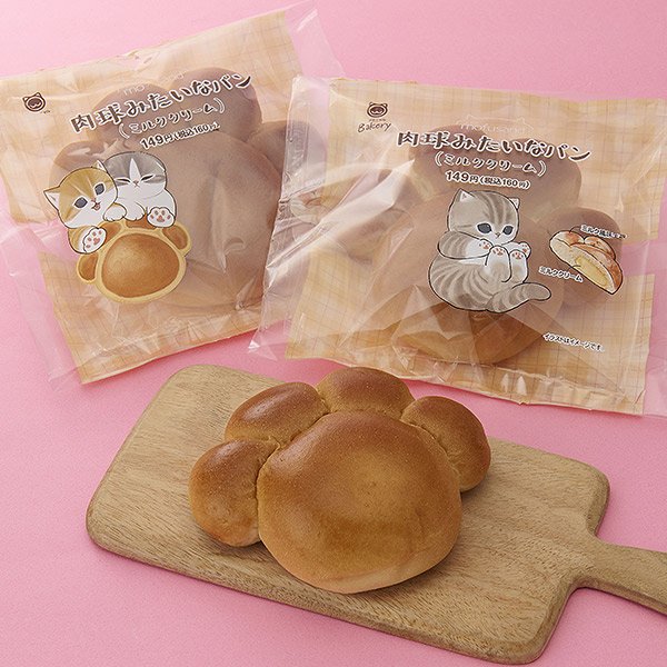 「肉球みたいなパン(ミルククリーム)はほんのりミルク風味のふんわり生地に、ミルククリームが入ったパンです。ねこの肉球をモチーフとしており、思わずぷにぷにと触りたくなる形をイメージしました。パッケージは「mofusand」とコラボレーションしたデザインで、全2種類です。」