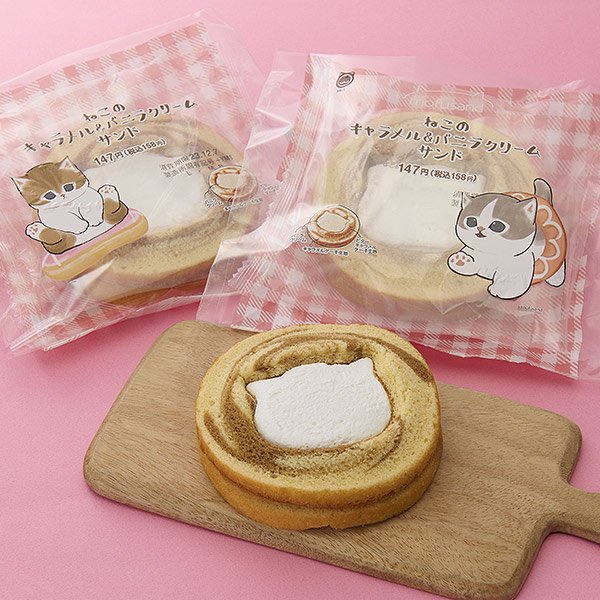 「ねこのキャラメル&バニラクリームサンドはねこの顔の形にかたどったケーキです。2種類のキャラメル生地をマーブル模様に仕上げたケーキに、バニラクリームをサンドしました。パッケージは「mofusand」とコラボレーションしたデザインで、全2種類です。」