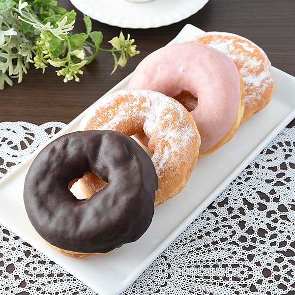 「粉糖がけ2個・チョココーティング1個・いちごチョココーティング1個のリングドーナツを詰め合わせた4個入りです。」