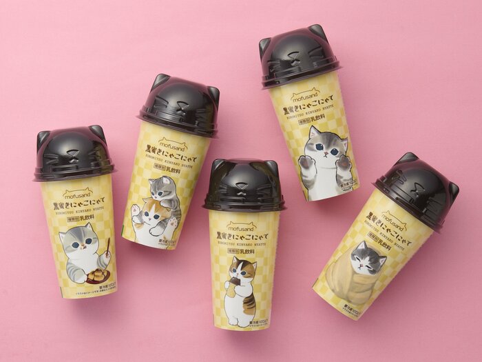 「黒蜜きにゃこにゃては香ばしいきなことコクのある黒蜜にミルクを合わせたデザート飲料です。オリジナルねこ耳キャップ付き。パッケージは「mofusand」とコラボレーションしたデザインで、全5種類です。※数量限定」